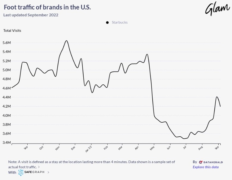 As customers flocked back to their favorite brands post-lockdowns, Starbucks enjoyed consistently high foot traffic through 2021. But as shown by data from SafeGraph, this traffic took a sharp nosedive in April and May of 2022. Dropping from 5,346,600 daily visitors on April 18 to 3,487,995 on June 27, in-store traffic decreased by nearly 35% in the span of just two months.