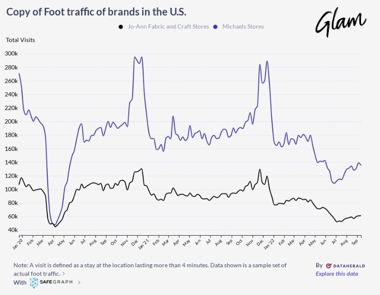 However, since shutdowns ended, craft stores seem to be feeling the fading interest of formerly enthralled crafters. According to foot traffic data from SafeGraph, Jo-Ann and Michaels have seen a staggering drop in visitors since the beginning of this year. While it doesn't measure actual sales, foot traffic is defined by the amount of time each customer spends inside of a store, from the moment they walk inside to the time they exit. Based on recent trends, it appears that many creators have put things on hold for now, in contrast with their pandemic-era productivity. Are craft enthusiasts really giving up on stores like Jo-Ann Fabrics and Michaels, or are other factors at play?