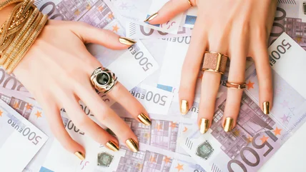For the maximalist look, give gold glamour a try. Similar to the golden beach look, this manicure style plays with heavy lines of gold and shiny elements. It's difficult to quantify this look, but luckily you don't need to put it into words. For this style, just show your nail technician a reference photo, and they should be able to take it from there.