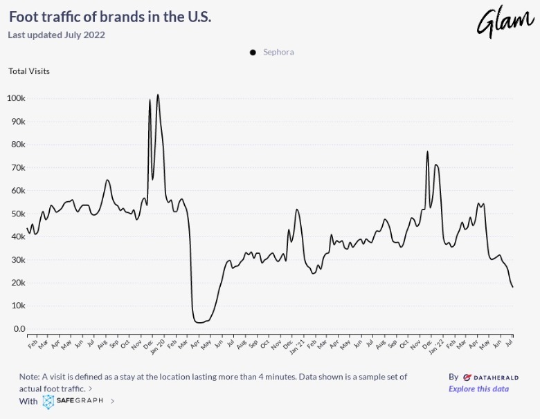According to data collected by SafeGraph, Sephora's foot traffic score in early April 2021 — around a year after lockdowns began — was 37,502, which wasn't even half of its highest number of visits from before the pandemic. Fast forward to early July 2022, and Sephora has an even lower foot traffic count at only 17,950 in a single day.