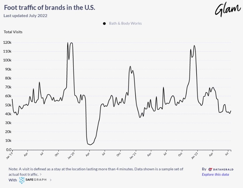 Analytics from SafeGraph confirm that this strategy has been a winner for the sweet-smelling brand. Observing foot traffic between January 2019 and July 2022, the only notable drop in store visitors was around April 2020, when the COVID-19 pandemic initially kept customers at home. However, within two months, traffic rebounded to pre-pandemic levels and has remained on its consistent course since then. Rarely does the chain's daily traffic dip below 40,000 visitors, and during the holiday shopping season, it can soar as high as 120,000 per day. So, even while malls across the U.S. are struggling (via The New York Times), the ongoing success of Bath & Body Works illustrates how smart seasonal sales can keep in-store traffic high.