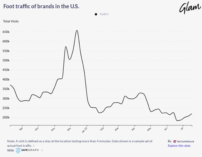 However, when we fast-forward to summer 2022, we see how the numbers have severely dropped. For example, one day in late June, Kohl's received only 182,906 visits. Then, it received 219,687 shoppers in a single day in mid-July. Therefore, the retailer has around 100,000 fewer in-person visits than it did about a year ago — a remarkable decline for the company known for bringing customers back with its Kohl's Cash rewards program.