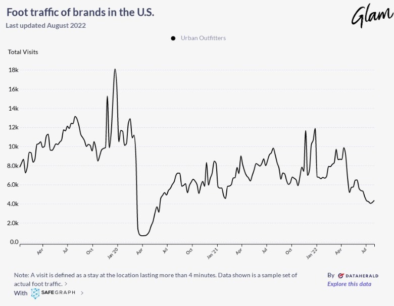 According to data collected by SafeGraph, Urban Outfitters did impressively in January 2020 with 18,000 visits in one day, shortly before the pandemic hit the U.S. In March, the national emergency was declared, explaining why the visits dropped to roughly 1,000 a day in April. Fast forward to 2022 when life has largely returned to normal and Urban Outfitters's retail traffic has begun regaining steam, registering roughly 12,000 unique visits during one day in January. Foot traffic at the retailer continued to fall from April to July. In July 2022, the retailer's foot traffic was one-third that of pre-pandemic 2020 and half that of 2021, when several restriction orders were still in effect. So, how is this even possible?