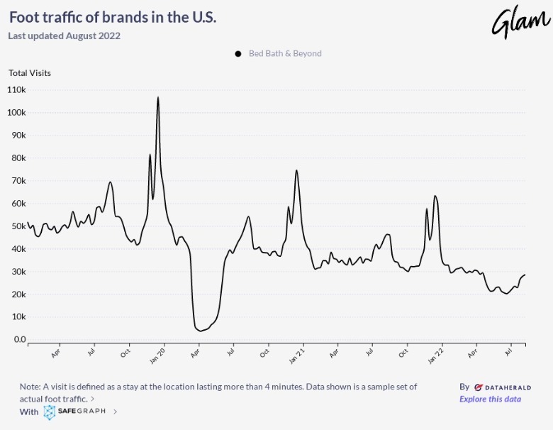 At this point, it's undeniable that Bed Bath & Beyond's brick-and-mortar stores are suffering from weak customer turnout. Following a steep drop at the beginning of the pandemic, data from SafeGraph shows a steady downward trend in visitors that has failed to notably recover — even though other retailers' foot traffic has returned to pre-COVID levels.